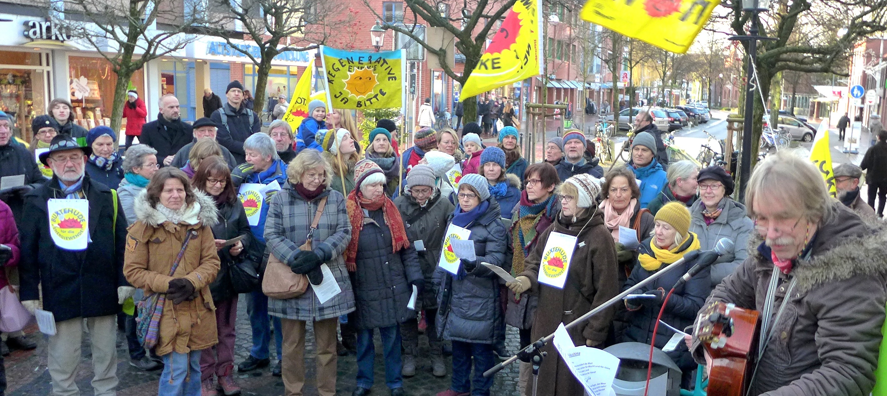 Atomkraftgegner und Musiker Harald Winter stellte fest, dass die Energiewende durch das Engagement der Antiatombewegung und der Klimaschutzbewegung wesentlich vorangetrieben worden ist. „Dadurch haben diese Bewegungen einen erheblichen Anteil an den Schritten und Maßnahmen zur Energiewende, sowohl hier in Buxtehude als auch in ganz Deutschland. Unser Engagement und unsere Beharrlichkeit zahlen sich aus“, freute sich Winter.