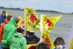 Am Samstagnachmittag erreichte die Radler:innengruppe in Begleitung von zahlreichen Stader:innen den Fährhafen in Wischhafen. Die Fahrraddemonstration war, wie üblich, von zwei Stader Polizisten eskortiert worden. Bei ihnen bedankte sich Sarah Lahl, die Bundeskoordinatorin der Fahrradtour (von der Organisation .ausgestrahlt) für die gute Zusammenarbeit. Schließlich bestieg die Gruppe die Elbfähre und hatte dabei schon das Atomkraftwerk Brokdorf als nächstes Etappenziel vor Augen (gedanklich, aber auch visuell).